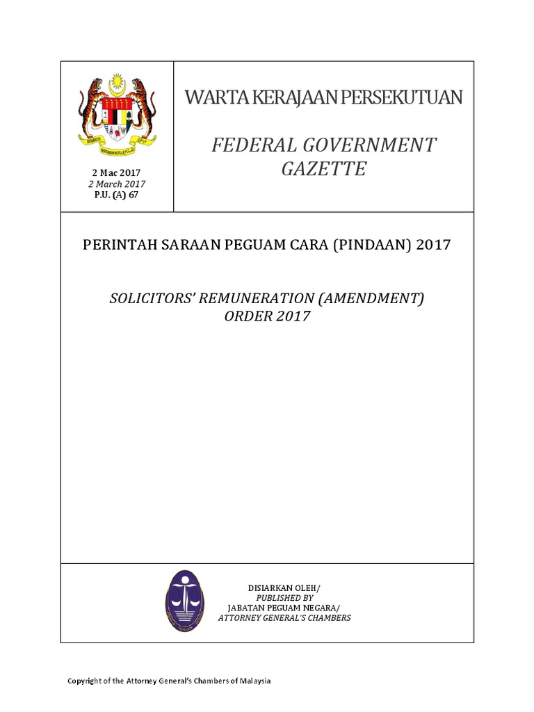47 establishes a committee which may make orders about the remuneration of solicitors in respect of non-contentious business. The Solicitors Remuneration Amendment Order 2017 SRAO has been gazetted and came into effect on 15 th March 2017. For the next RM2000000.